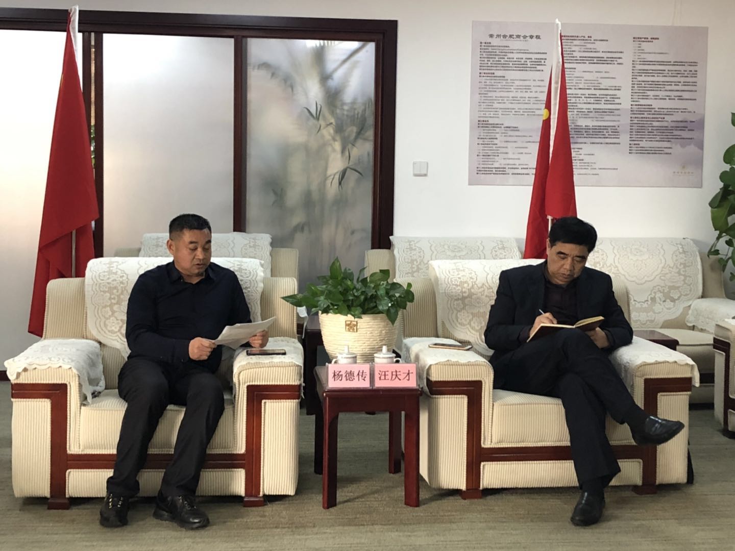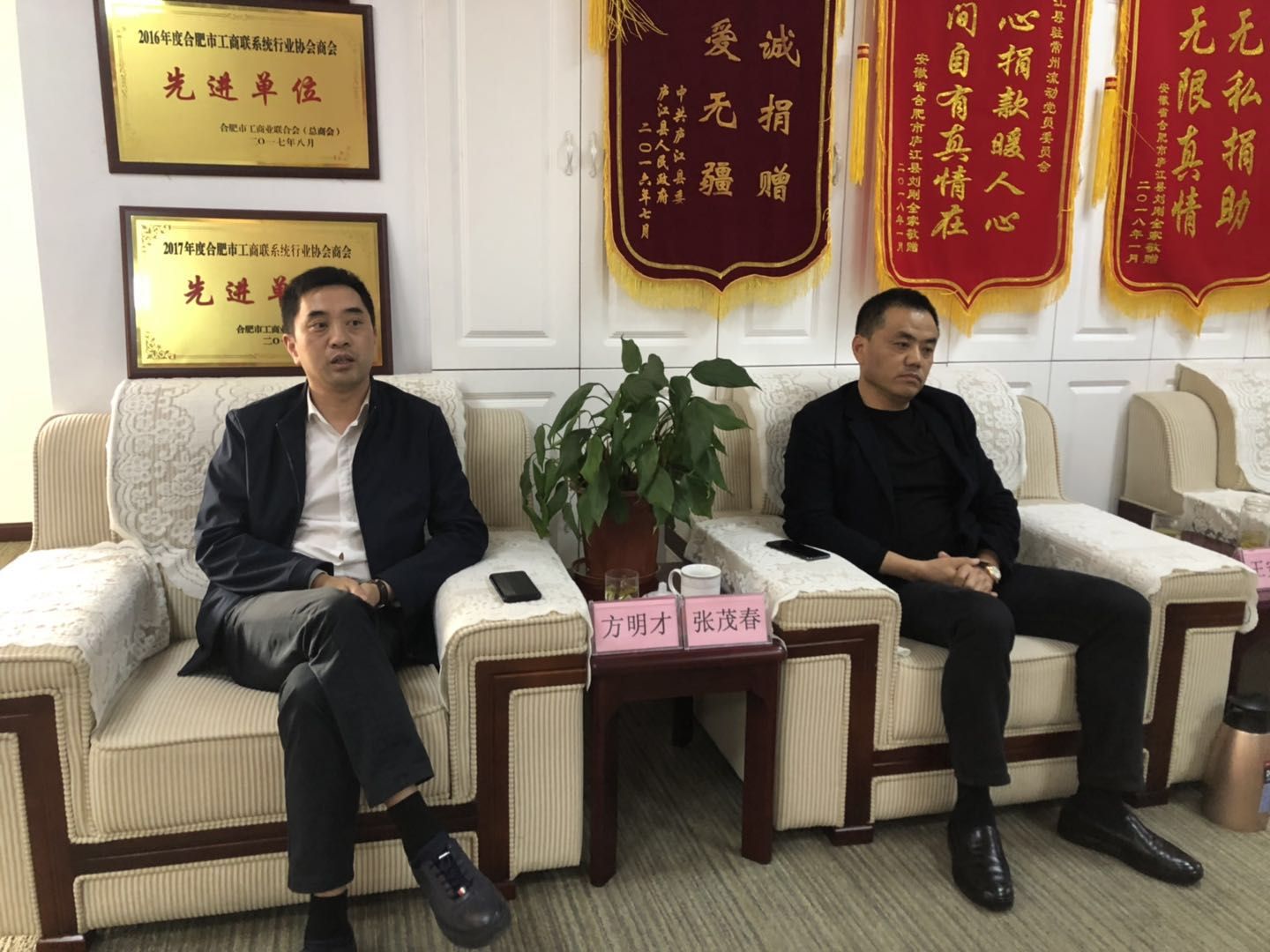 随后,考察团来到商会与商会企业家代表进行了座谈。会上,常州合肥商会执行会长、庐江县驻常州流动党委书记杨德传对汪主席一行莅临商会指导表示热烈的欢迎和衷心的感谢,并向考察团一行汇报工作。1、对常州合肥商会发展历程、组织架构及会员分布等情况介绍。商会在过去的三年里,在加强商会班子建设、加强与两地政府联动、外出学习考察活动、慈善公益等方面做出了一些有影响力的工作和成绩;2、对近年来党建工作情况作了汇报。随着庐江县驻常州流动党员队伍的不断壮大,建立了流动党员登记簿,加强了阵地建设,开展了各项学习活动,培养优秀了党员和入党积极分子;3、对商会“以商养会”模式成果汇报。常州常合商贸股份有限公司成立以来,商会不再以会费为唯一经费来源;从目前经营情况看,既用活了会员股东的暂时闲置资金,商会日常活动也得到了商贸公司的大力支持,又为商会及会员企业节约了开支,会员股东每年都能有应得的分红。考察团一行在听完汇报后,对常州合肥商会自成立以来所取得的成绩以及对社会所做的贡献给予了充分肯定。