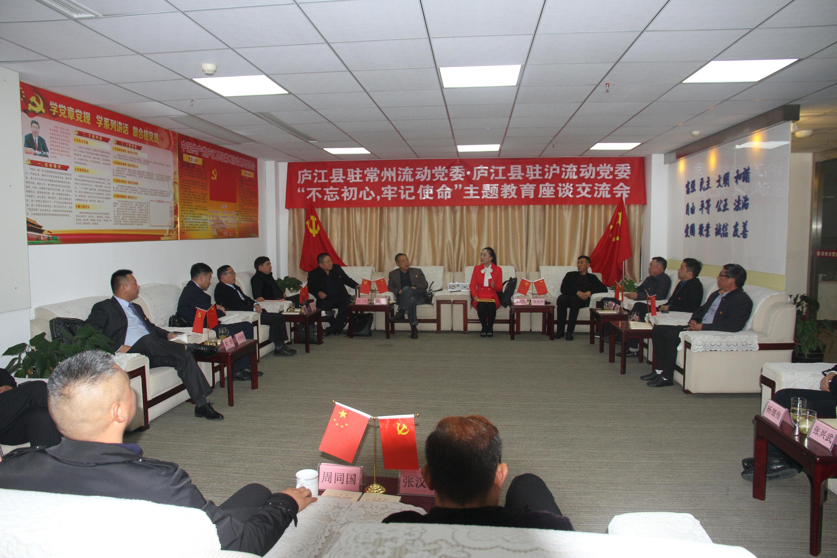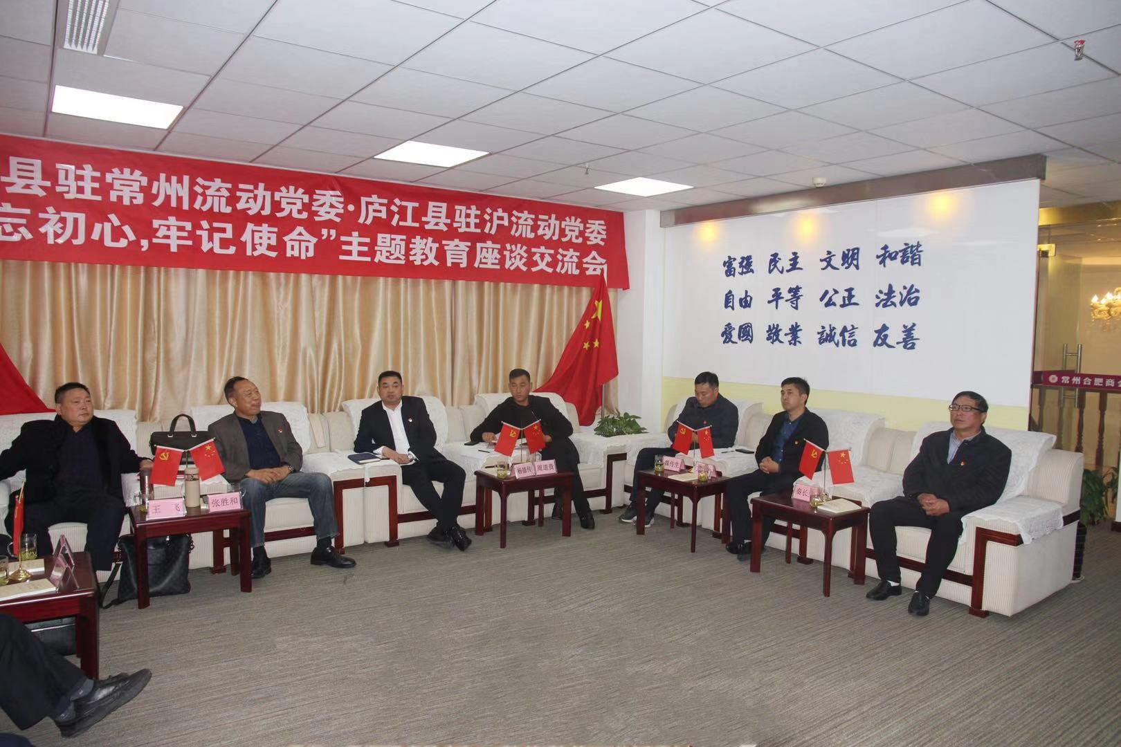 2019年11月30日,庐江县驻沪流动党委书记张胜和、上海庐江商会会长王飞等一行15人来常州就党建工作进行互动交流。庐江县驻常州流动党委接待了驻沪流动党委一行,并召开了“不忘初心,牢记使命”主题教育座谈会。